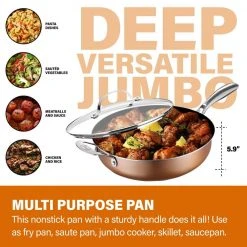- Jumbo cooker / saute pan – this deep multipurpose pan is perfect for searing, sauteing, braising, and pan roasting or use it to make flavorful pan sauces and gravies, designed to respond quickly to changes in cooking temperature, this professional pan features high sides to contain spatters and keep foods inside as you stir and toss them over high heat