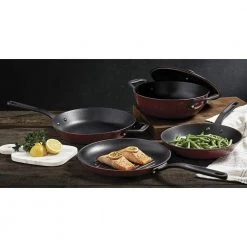 The enameled cast iron cookware set from Mason Craft & More is a beautiful piece of cookware designed for long-lasting performance and durability. The enameled cast iron construction enhance the cooking process by evenly distributing heat and locking in moisture to deliver tender, flavorful food. Perfect for everything from slow-cooking to baking, these cookware set is essential for any kitchen collection.CONTAINS :* 4.5Qt Braiser* 11″ Grill Pan* 10″ Fry Pan* 12″ Fry Pan