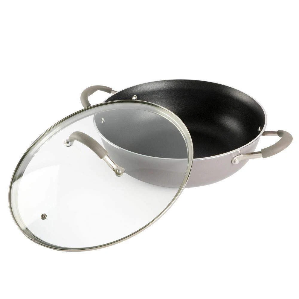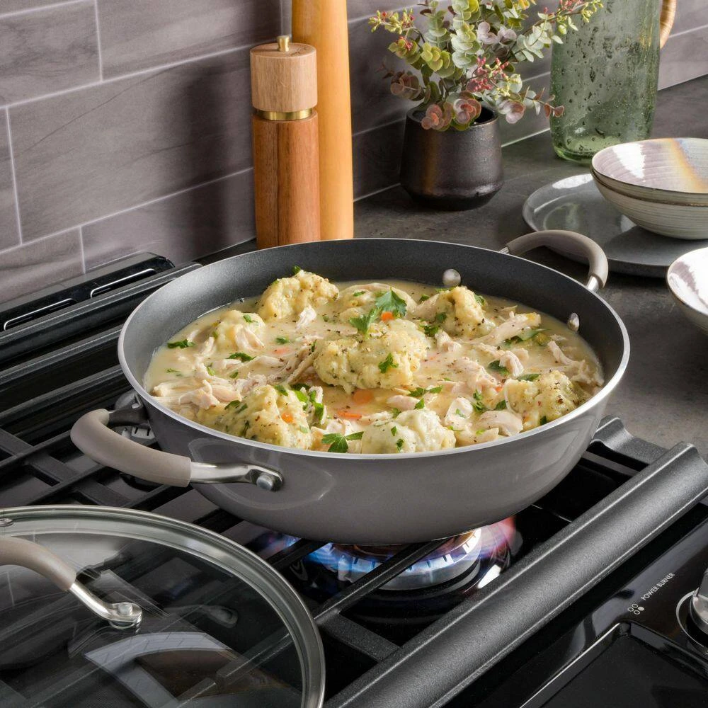Cook to your heart’s content with the Cravings By Chrissy Teigen 5 Quart Enameled Aluminum Everyday Pan in Shadow with Silicone Handles. Perfect for cooking a variety of dishes, it’s aluminum body distributes heat evenly for uniform cooking. This Saute pan is compatible with any gas, ceramic, and electric heat sources. The silicone handles allow for cool touch use even during high heat cooking.