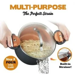 When it’s time to strain, it can be such a pain. You splash and spill your pasta everywhere. Not anymore. introducing the Gotham Steel nonstick pasta pot – the revolutionary pasta pot. Gotham Steel pasta pot is the revolutionary, 5-quart pasta pot complete with a lock-on lid that doubles as a smart strainer. The tempered glass lid has large holes on one side for draining larger foods like potatoes and ravioli, and small holes on the other for smaller foods like spaghetti and vegetables. Just lift and lock and you’ll get a steady pour like never before. it’s that easy. plus, with the Gotham Steel copper-infused, scratch-resistant surface, you can boil and mash potatoes in the same pot. even cheesy chili mac is no match for the Gotham Steel pasta pot’s non-stick surface.