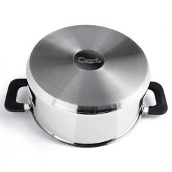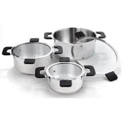 Designed to outperform on electric, gas, infrared, inductive, glass, ceramic and traditional stoves, the Ozeri 6-Piece Stainless Steel Inductive Pot Set with Straining and Hands-Free Glass Lids both enhance and simplify the cooking experience. This versatile 6-piece set includes an uncompromising 4.5 l (4.8 Qt.), 2.7 L (2.9 Qt.), and 1.3 l (1.4 Qt.) stainless steel pot, each with accompanying glass lids, that stack together into the large pot for space-saving utility. The Ozeri pots are made of commercial-grade 18/8 SS304 stainless steel with tri-ply construction for enduring performance that resists discoloration and prevents unwanted reactions with food. Each pot includes a matching adaptive glass lid with an integrated steam vent and heat-resistant silicone-coated handles. These innovative lids easily rotate from a tight seal that retains moisture, nutrition and flavor, to a measured opening for effortless straining without the use of a separate colander. In addition, the patent-pending Ozeri lids stand freely when inserted in the pots specially designed side handles, creating a unique hands-free configuration that obviates the need for counter space or that third hand when stirring, cooking or serving. Made for a lifetime of satisfying use, each pot boasts a brushed interior, polished exterior, and a magnetized impact-bonded base for unrivalled heat conductivity, distribution and retention, thereby eliminating hot spots. Ships with a limited lifetime warranty.