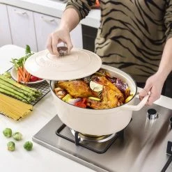 The enameled cast iron dutch oven with a self-basting Lid, ideal for delicious dinners for any occasion. The oversized handles and stainless-steel knob provide a sturdy grip for easy handling and carrying. Interior enamel has a smooth finish that promotes caramelization, prevents sticking, and resists stains. Ideal for roasting meat, slow cooking stews, baking bread and all kitchen tasks. You’ll enjoy a lifetime of healthy cooking with your vancasso cookware.