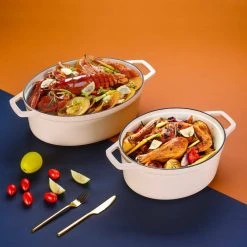 - Round shape is particularly suited for larger cuts of meat, whole chickens, and for baking oval-shaped loaves of bread
