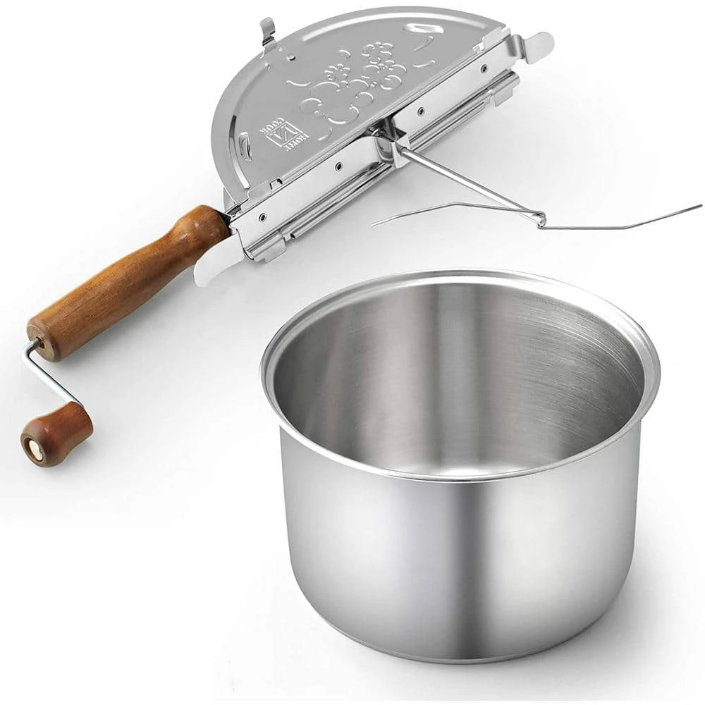 The Cook N Home 6 qt. stainless steel stovetop popcorn popper is made with stainless steel with an encapsulated aluminum Bottom. Aluminum layer bottom provides even heat distribution and prevents hot spots. Durable metal gears for stirring. Stainless steel lid has steam vents to keep popcorn crisp. Wooden handle and knob stays cool and is comfortable. Makes popcorn in a few minutes and is easy to pour. Mixes kernels so they do not stick or burn. Induction compatible and works on gas, electric, glass, ceramic, etc. Not dishwasher safe, wipe with cloth to clean.