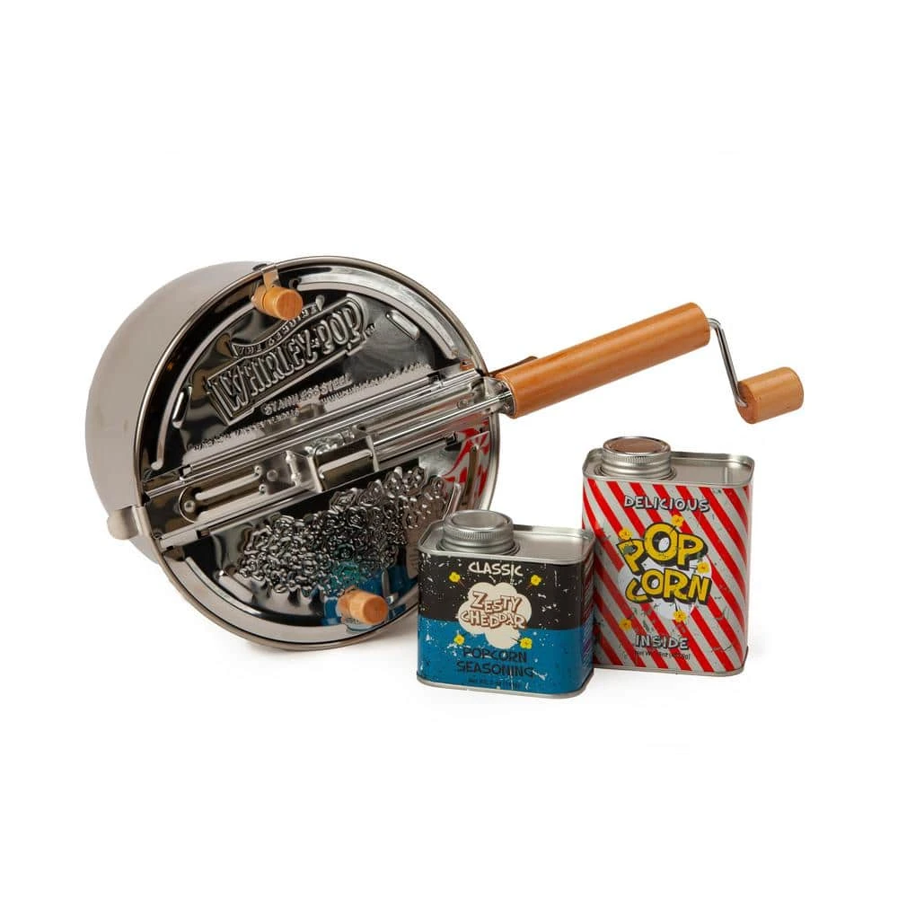 - Stainless Steel Whirley Pop – with metal gears that ensure that every kernel pops and your seasonings are evenly distributed, you’ll get a tub full of insanely good popcorn every time.