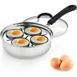 The Cook N Home 4 cup stainless steel egg poacher pan with lid, 8″ is durable, heats evenly, and prevents hot spots. 4 Non-Stick Cups holds 1 extra large egg each. Tempered glass lid with steam vent makes viewing food easy and keeps heat/moisture in. To use: fill pan with water, put eggs/food in cups, and cook to desired firmness. Cups can be removed to be used as a saute pan. Induction compatible. Works on: gas, electric, glass, halogen, ceramic, etc. Dishwasher safe, hand wash recommended.