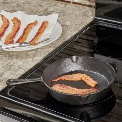 Designed to last for years to come, this skillet is seasoned with natural plant oil for a smooth, quick-release finish that improves over time. Side pour spouts enable you to drain out excess grease and oil. Hanging hole in handle lets you store on a kitchen rack when not in use. Made from heavy duty cast iron, it provides superior heat distribution. The pan is pre-seasoned with natural oil and ready to use at your convenience. Ideal for both indoor and outdoor cooking. Use on a stovetop or on an outdoor grill. Enjoy the durability and convenience that this premium cast iron cookware can bring to your life. Hand wash with warm water and use mild soap. Dry thoroughly with a soft towel. Item dimensions may differ slightly due to the unique nature of the product. Color and finish may also differ from the images shown due to differences in monitor displays. Props and accessories are not included.