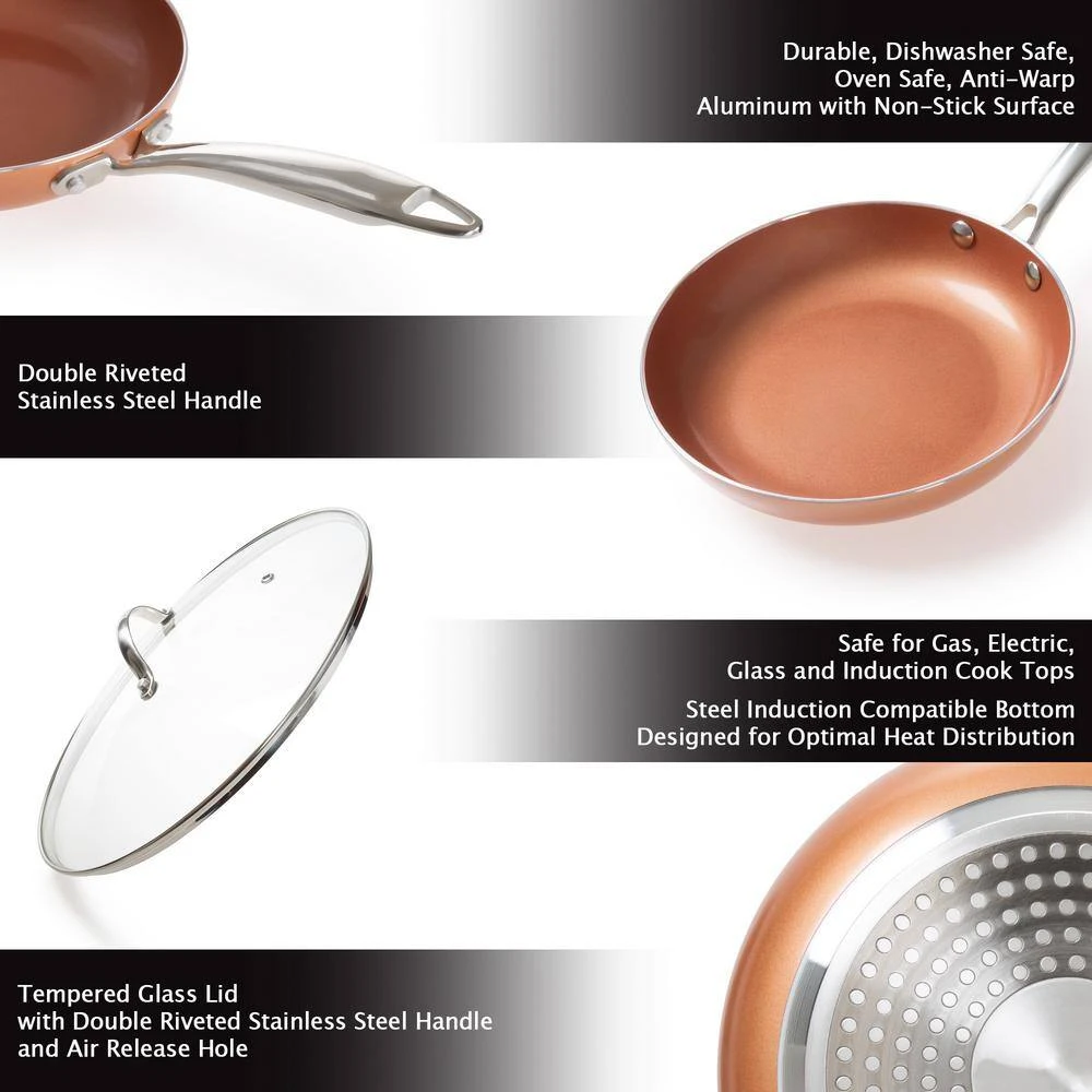 - 8-piece set includes: 1.5-quart saucepan, 2-quart saucepan, 5-quart saute pan, 10-inch fry pan, 11-inch fry pan, and 3 lids