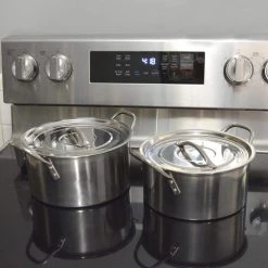 Simmer and boil delicious soups, stews, and broth with the AmeriHome 8 Piece Stainless Steel Stock Pot Set. Four pots with matching fitted lids are constructed of 202 grade stainless steel, which conducts heat well, plus it is tough and long lasting. Ideal for the campsite, or as an extra set of pans in the trailer or RV. The stainless steel construction also makes this set dishwasher safe, so clean-up is simple. Two riveted handles on each pot can safely take the weight of a full Stock Pot. Hollow handles on the lid stay cooler to the touch.