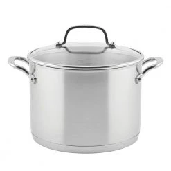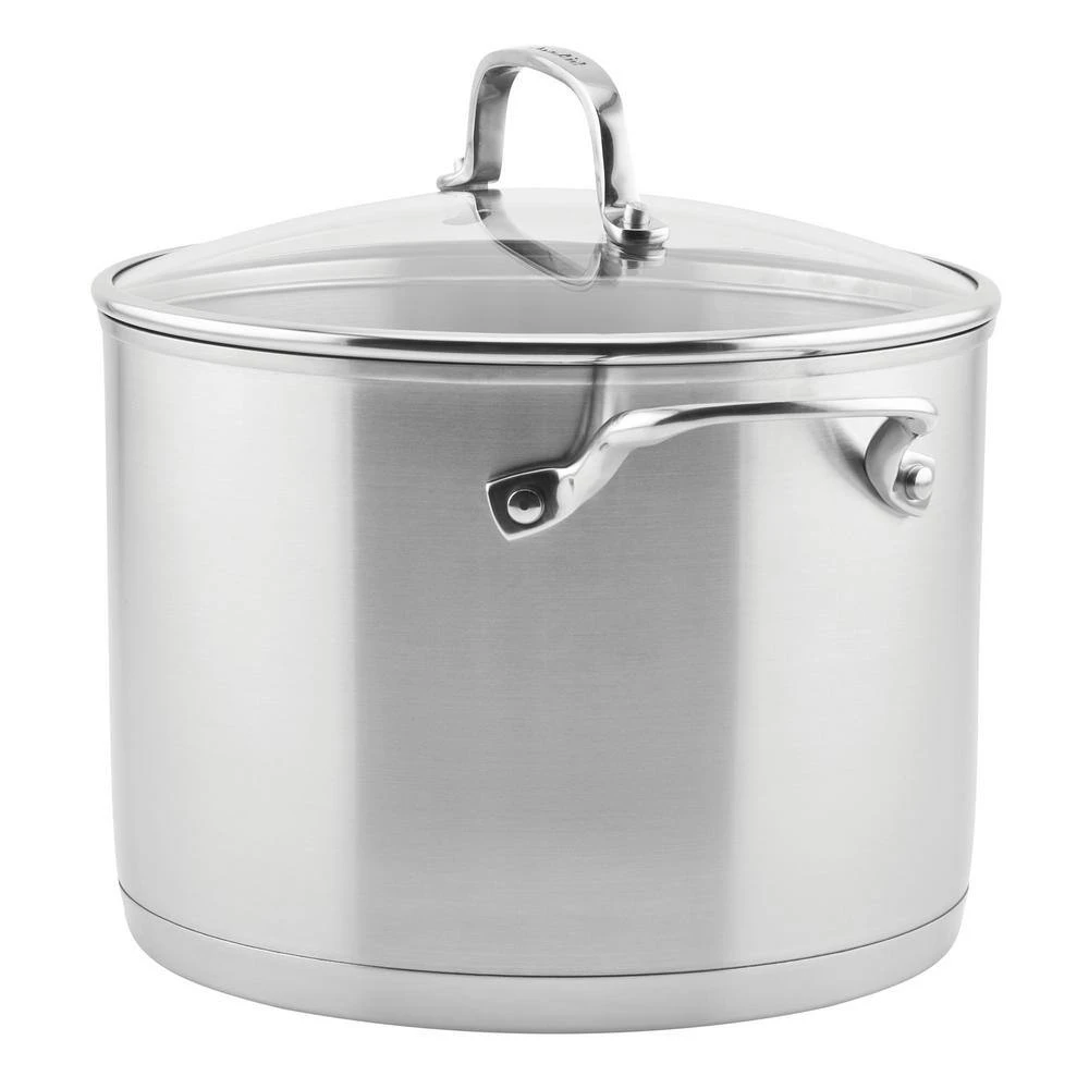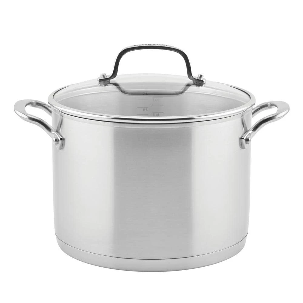 Experiment with and discover new flavors and techniques when cooking with the KitchenAid 3-Ply Base Stainless Steel Stockpot, designed with an extra thick layer of heat-conducting aluminum to eliminate hot spots by distributing heat evenly from edge to edge. Heavy-gauge stainless steel pot features a heavy bottom base for lasting durability, and has etched measuring marks to explore and test ingredients for new recipes. Tempered glass lid helps to lock in heat for rich and textured flavor. Curious cooks can investigate a wider range of recipes in the broiler and oven, where cookware is safe to 500°F, 350°F with lid.