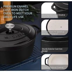 - Our enameled cast iron dutch oven uses 100% PFOA free, lead-free and cadmium-free enamel coating, and cast iron ecological materials, which is non-stick, anti-rust and anti-corrosion, easy to clean, and no retained flavors of food