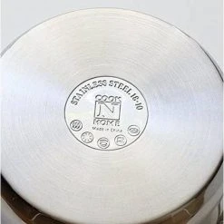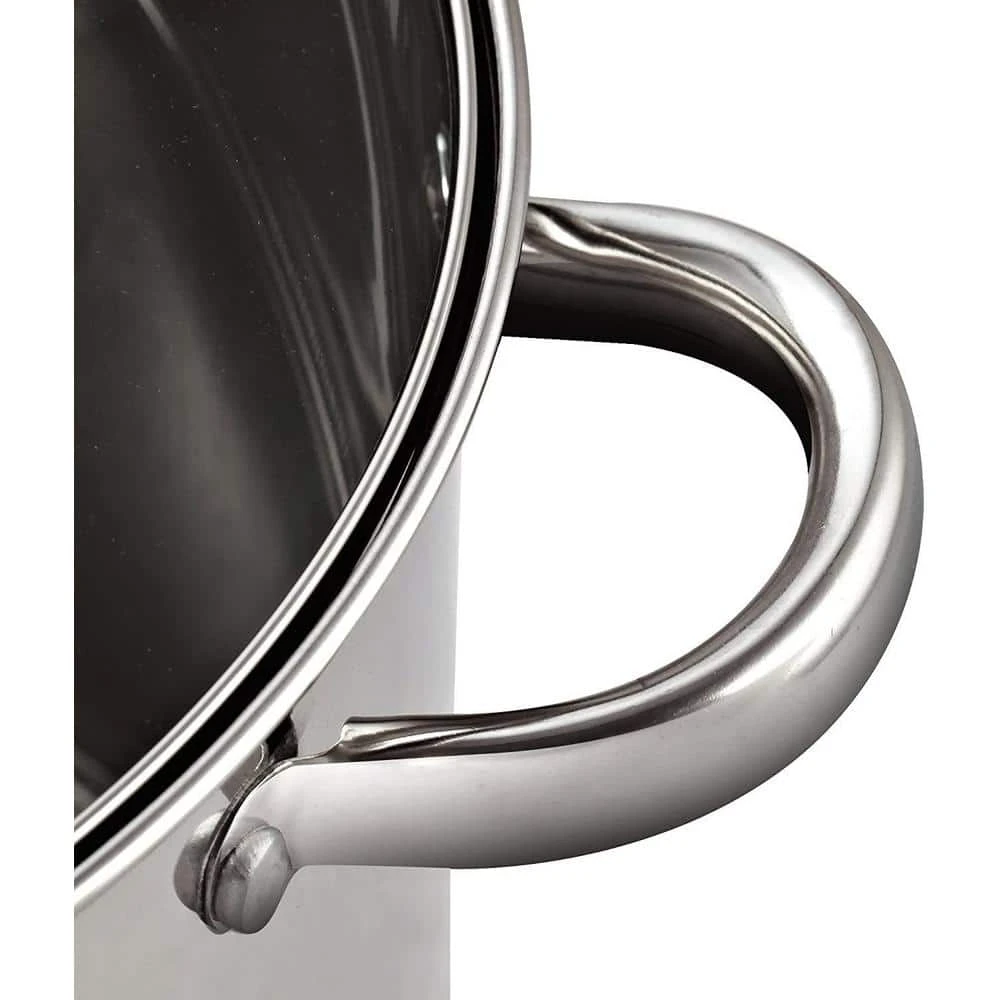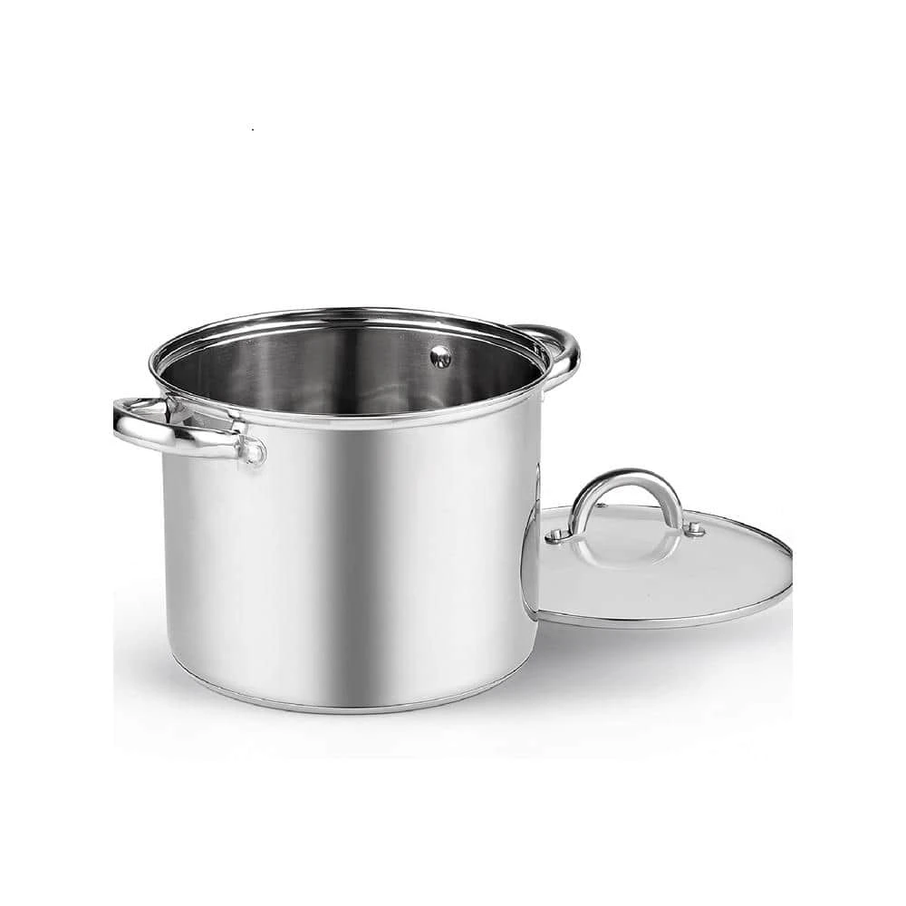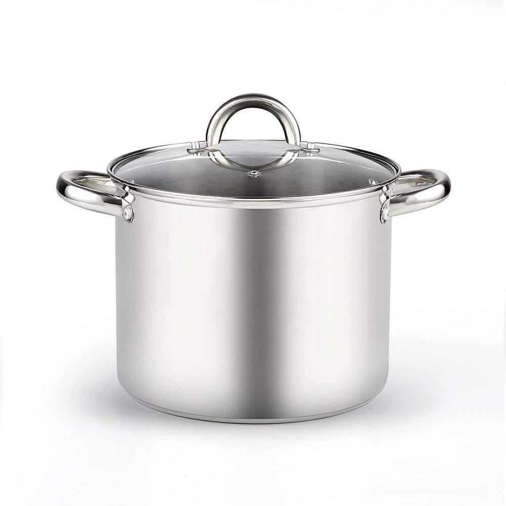 The Cook N Home 8 quart Stainless Steel stockpot with lid has a mirror-polished Stainless Steel body and an aluminum disc layered in the bottom between Stainless Steel. Capsuled aluminum disc provides even heat distribution and prevents hot spots. Tempered glass lid with steam vent makes viewing food easy from start to finish. Comfortable handles are riveted for durability to carry. Large Capacity for multiple uses and endures long heating. Induction compatible. Works on gas, electric, glass, ceramic, halogen, etc. Oven safe to 500F, glass lid to 350F. Dishwasher safe.