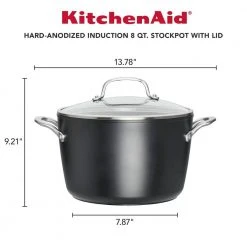 Take control with even heat and achieve consistent results when cooking with the KitchenAid Hard Anodized Induction Nonstick Stockpot with Lid. Crafted from heavy-gauge, hard anodized aluminum, this stockpot is durable enough for everyday use to experiment with new, exciting recipes and cooking techniques in the kitchen. Thick, forged base is designed to heat evenly, eliminating hot spots for rich, flavorful results on any stovetop. Triple-layer, PFOA-free nonstick on the cookware interior and handle rivets provides effortless food release for a completely nonstick cooking surface. Meet recipes head-on with an induction compatible pot that is oven safe to 500°F (350°F with lid). Dishwasher safe for easy cleaning.
