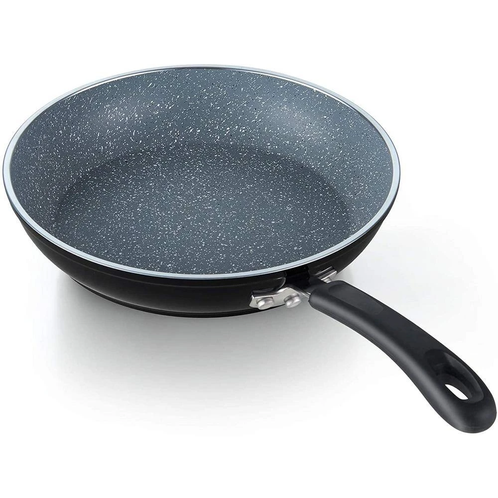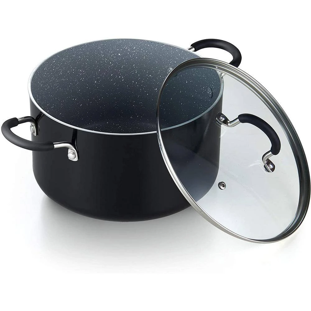 The Cook N Home 8-Piece Nonstick Heavy Gauge Cookware Set, Marble includes: 1 and 2 quart saucepans with lids, 6 quart stockpot with lid, 8 and 9. 5 inch fry pans. Made of thick gauge aluminum that provides even/quick heat conduction and prevents hot spots. Nonstick makes food release/cleaning easy and allows for healthy cooking. PFOA, cadmium, nickel, and lead free. Riveted handles are comfortable and stay cool with a hole for hanging. Tempered glass lids with steam vent to view cooking and fits on fry pans. Works on gas, electric, glass, ceramic, halogen, etc. Induction compatible, but due to the small size of the saucepan it may not be compatible. Oven safe to 375F. Dishwasher safe.