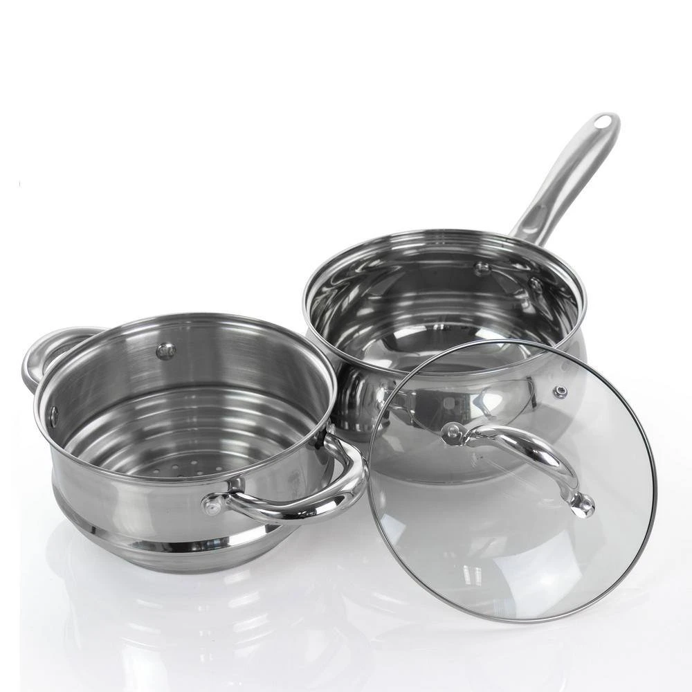 - Set includes: one 1.3 qt. saucepan with lid, one 3 qt. saucepan with lid, one 2.3 qt. steamer insert, one 6.5 qt. dutch oven with lid, one 5.6 qt. saute pan with lid, 3-nylon tools