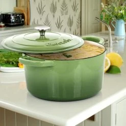 The Crock-Pot Artisan 2 Piece 7 Quarts Enameled Cast Iron Dutch Oven is ideal for delicious dinners for any occasion. This cookware’s self-basting lid creates a continuous basting environment for more flavorful meals. It distributes and retains heat evenly and allows for a multitude of cooking techniques. The oversized handles and stainless steel knob provides a sturdy grip for easy handling and carrying. This cooking pot is perfectly suitable for a large array of dishes such as baked potato soup, spiced rice, and warm curry for the family to enjoy.
