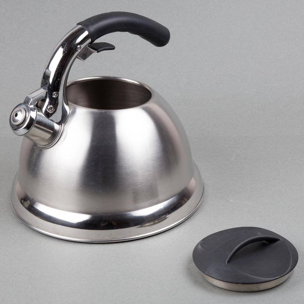 Whistling tea kettle made of heavy gauge stainless steel which features an aluminum capsulated bottom. A lever system which lets you open and pour the kettle without the risk of burning your fingers. This has an insulated handle with easy pour and fill.