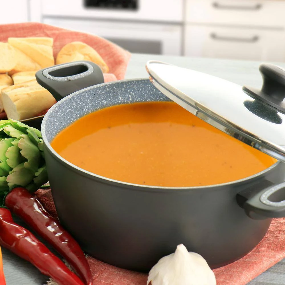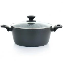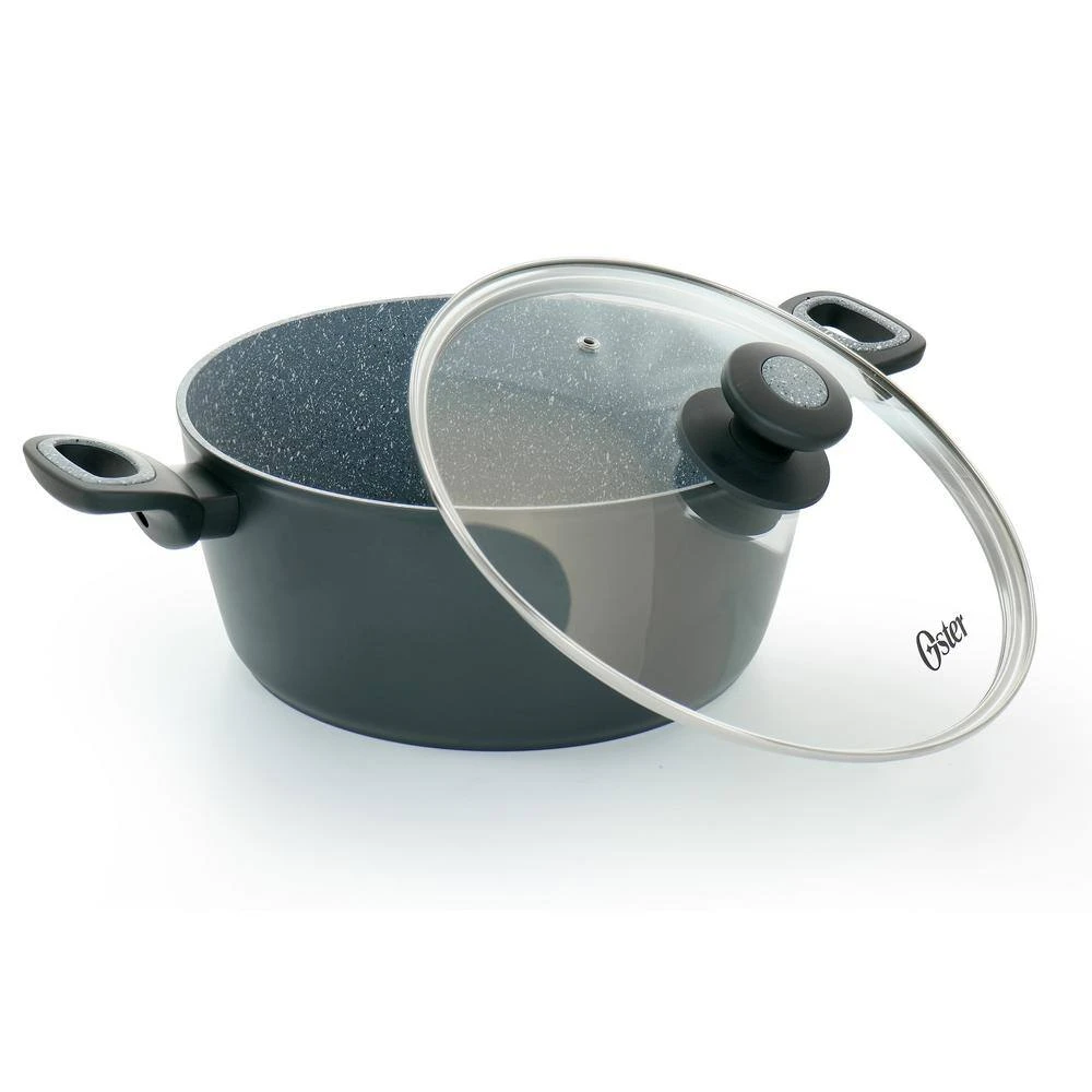 Cook to your heart’s content with the Oster Bastone 5.3 qt. Nonstick Aluminum Dutch Oven in Speckled Gray. Its aluminum body allows for even heating for a proper cooking process. Cut down on oils and fats with the nonstick coating, allowing for healthier meals. The cool touch soft grip handle and knob provide safe handling regardless of the heat. Put together fantastical dishes ranging from curries, to stews for guest to enjoy.