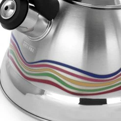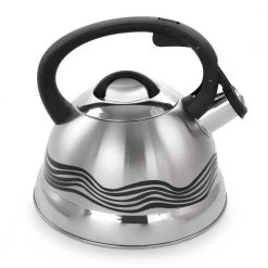 Jump start your morning with the Mr. Coffee Cagliari 1.75 Qt. Stainless Steel Whistling Tea Kettle with Stay Cool Handle. Features unique black stripes that change colors when the kettle is heated. The flip open spout includes a built in whistle to indicate boiling water. Its bakelite handle stays cool under heat for safe and easy handling. Serve guest with herbal tea, artisanal pour over coffee, or a comforting cup of hot chocolate.