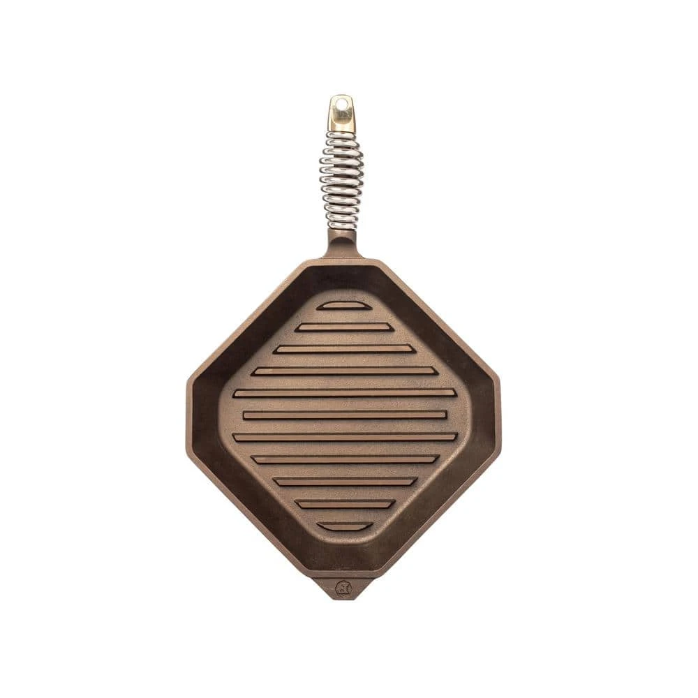 Hand crafted premium cast iron makes this grill pan an ideal tool for searing, blackening and grilling your favorite meats and veggies both indoors and out. The cast iron retains heat while balancing out temperature variations throughout your prep work, while the Speed Cool stainless steel spring handle stays cool longer and cools down quickly. CNC machined polished easy release surface minimizes sticking and makes cleanup a breeze. FINEX rounds it out with a thick base and walls for constant, even heating and superb heat retention for perfect searing every time. FINEX draws inspiration from vintage American cast iron skillets, fashioned for the demands of the contemporary kitchen.