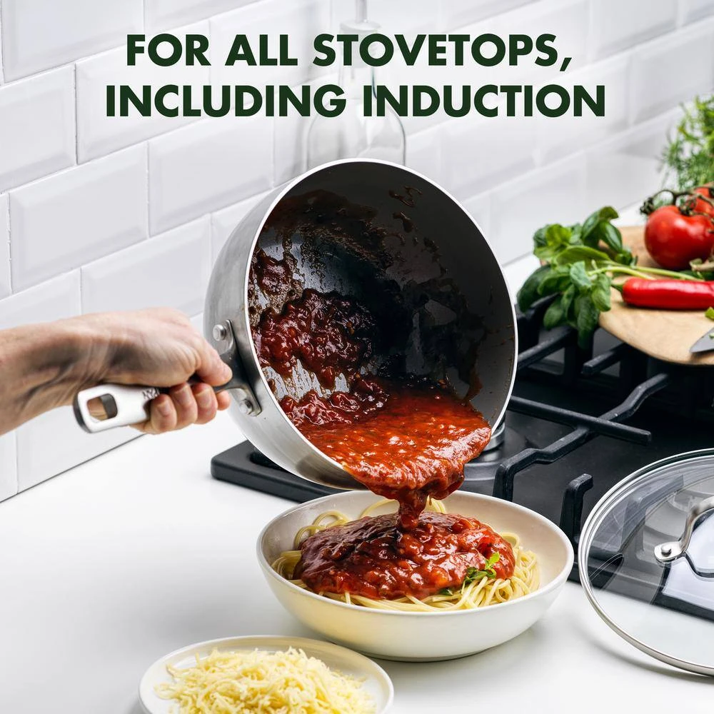 3 layers make the Chatham Stainless collection a kitchen powerhouse. A full aluminum core is pressed between 2 stainless steel layers to bring out the best in both metals aluminum’s quick heating and stainless’s incredible durability. Designed for daily life, our chef’s pan is a classic go to for just about anything. This stovetop staple is designed for a wide range of techniques including sauteing, braising, frying, and so much more. And don’t worry about cleanup. The metal utensil safe pan features a diamond enhanced ceramic nonstick coating that delivers ultra fast performance and effortless nonstick release.