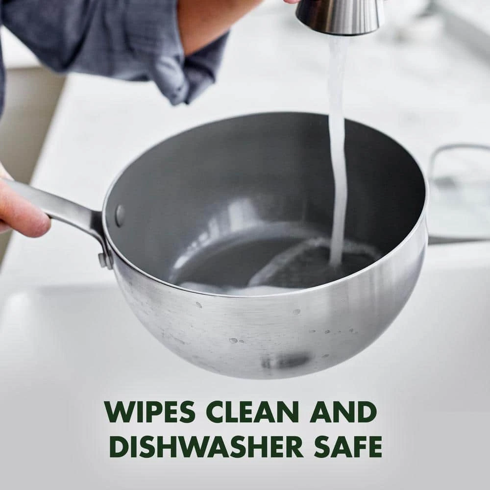 - 3-ply stainless steel: 2 layers of stainless steel with a full aluminum core for fast and even heat distribution