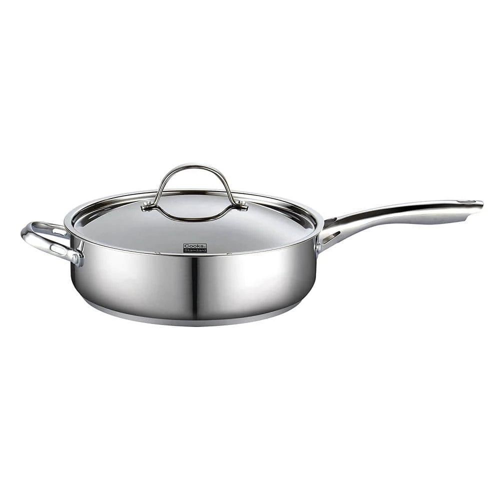 The Cooks Standard 5 Qt. Stainless Steel Saute Pan with Lid is made with stainless steel with an aluminum disc layered in the bottom. The aluminum disc provides even heat distribution and prevents hot spots. Stainless steel lid keeps in heat and moisture, oven safe to 500°F. Handles are attached to the cookware with 2 rivets that offers durability. Cookware is suitable with gas, electric, ceramic, glass and induction stoves. Dishwasher safe.