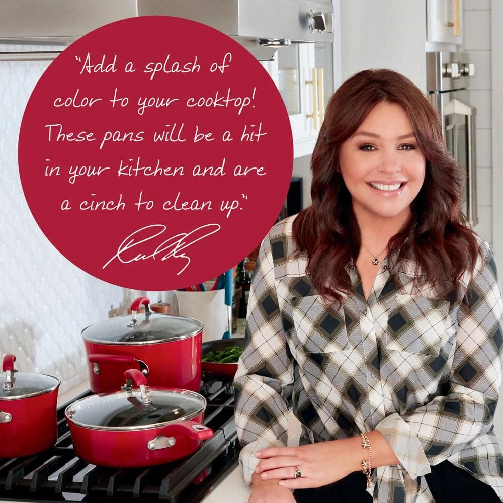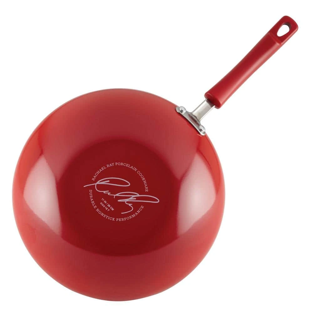 - DURABLE RACHAEL RAY WOK: Stir fry pan features sturdy aluminum construction for fast and even heating with a durable hard enamel exterior finish