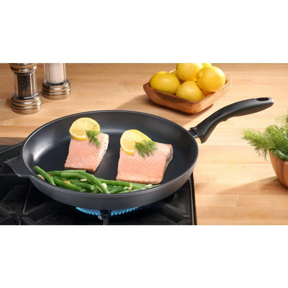 Swiss Diamond’s largest Fry Pan, the 12.5 in. (32 cm) skillet, is perfect for pork chops and other large cuts of meat. The diamond-reinforced coating browns like stainless steel without the messy clean-up. Trying to drop some lbs. no problem – Swiss Diamond’s exceptional nonstick surface allows cooking with little to no oil for a healthier meal. Designed to stay cool on the stove, the ergonomic handle provides balance and comfort as you prepare your favorite recipes. The thick cast aluminum walls distribute heat uniformly across the pan to warm contents evenly.