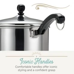 Making family-sized side dishes is a breeze with this Farberware Classic Series Stainless Steel 4-Quart Saucepot with Lid. Farberware has been trusted for over 100 years, and this saucepot continues that tradition for a new generation. A full cap base featuring a thick aluminum core surrounded by stainless steel provides rapid, even heating. Boil a batch of russet potatoes and mash the spuds right in the pot. The saucepot also works great for cooking artichokes, cauliflower and other vegetables. Heavy-duty stainless steel is polished to a mirror finish for a classic touch, and the ample, comfortable saucepot handles with iconic styling provides a confident grasp. A self-basting lid helps seal in heat and moisture, ideal for simmering a big batch of Spanish rice. This saucepot also is dishwasher safe and oven safe to 350°F. This convenient saucepot will make any Farberware cookware set even more versatile. Enjoy durability, performance and easy cleanup with this Farberware Classic Series Stainless Steel 4-Quart Saucepot with Lid.