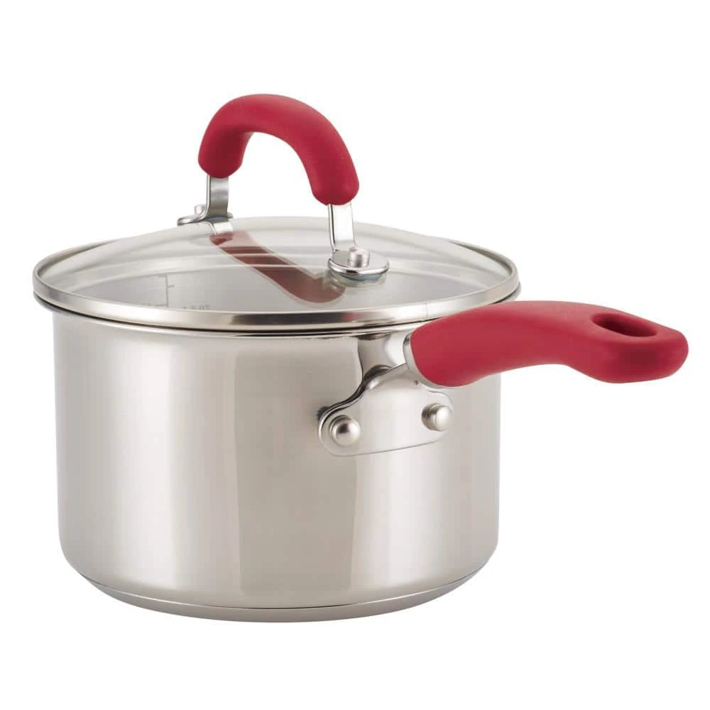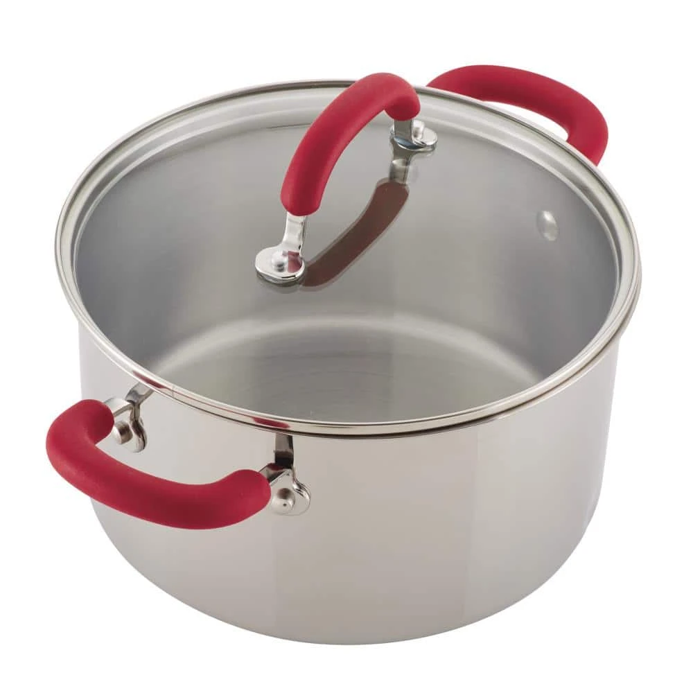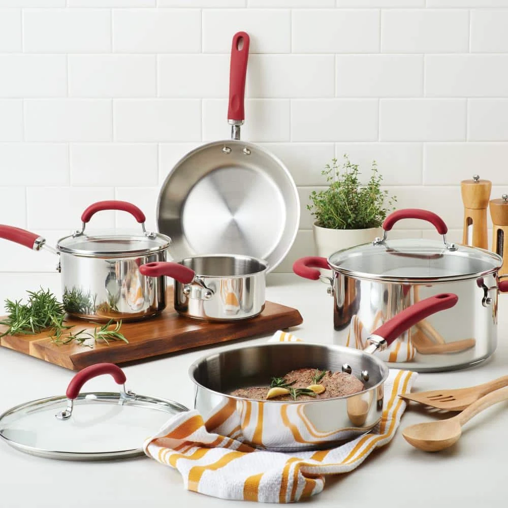 The Rachael Ray Create Delicious 10-Piece Stainless Steel Cookware Set brings high performance and easy convenience to home chefs eager for kitchen versatility with style. Featuring stainless steel construction, this collection of essential pots and pans boasts engineering for even heat distribution to reduce hot spots that can burn foods. The polished stainless steel cookware features etched measurement markings for gauging quantities while cooking and an induction-compatible base provides ultra strength and durability for years of cooking enjoyment. Colorful, dual-riveted stainless steel and silicone handles provide comfort and control and all of the pots and pans are oven safe to 400°F. The shatter resistant glass lids lock in heat and flavor while allowing foods to be monitored while they cook. Plus, the whole cookware set is dishwasher safe for fast and easy cleanup. From dishwasher-safe convenience to enhanced durability and polished shine, reach for the Rachael Ray Create Delicious 10-Piece Stainless Steel Cookware Set and get ready to create delish.