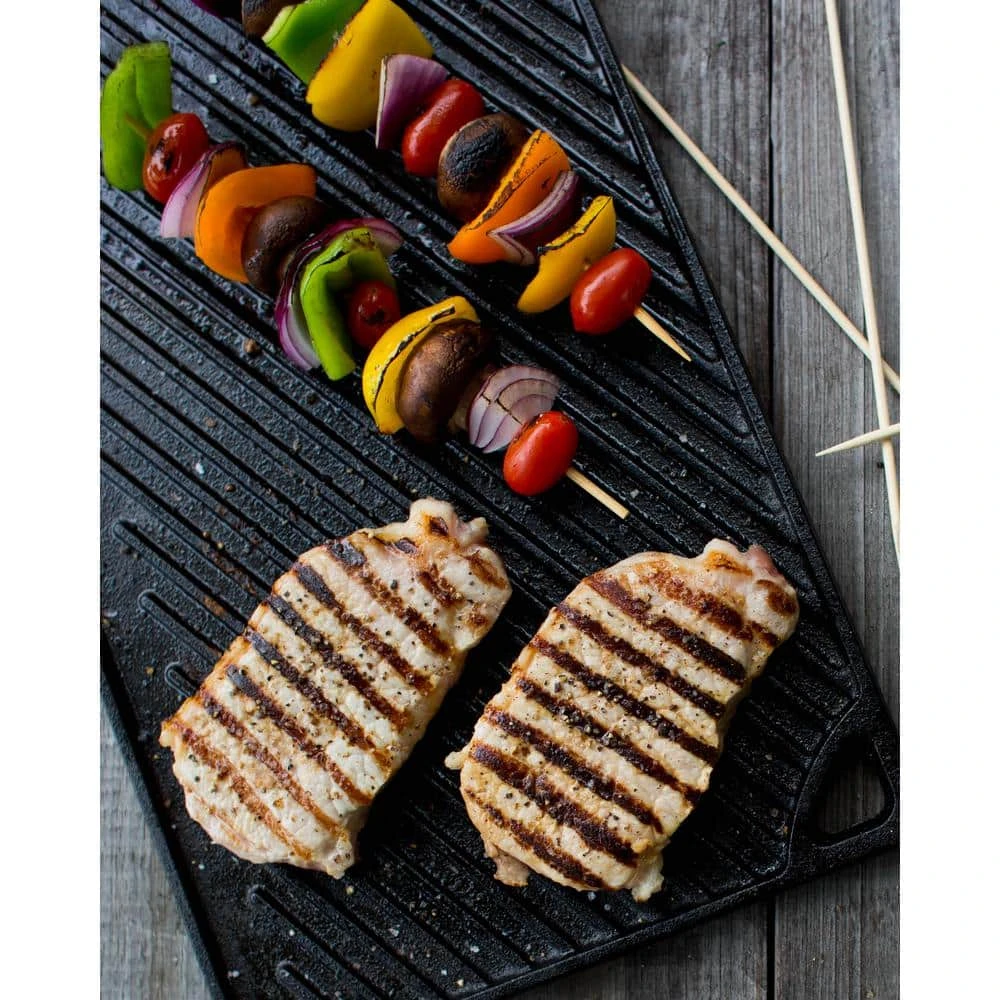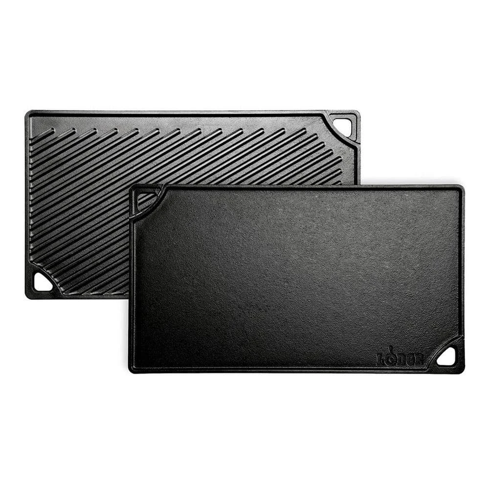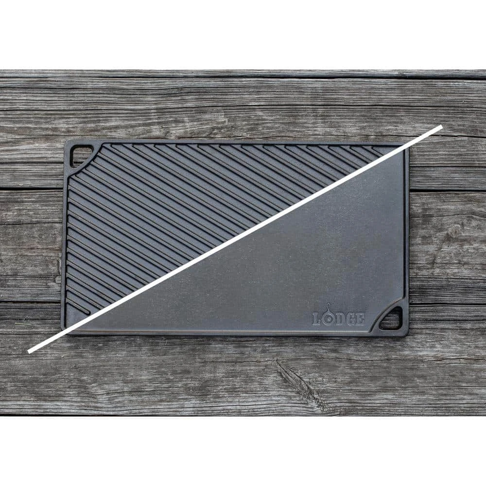 The Lodge 2 burner reversible griddle features a smooth side for making grilled cheese sandwiches as well as eggs and pancakes. The ribbed side is perfect for grilling foods such as steak, fish, chicken and hamburgers. Cast Iron seasoned reversible Grill/Griddle. Use the smooth side for eggs and pancakes and the grill side for foods such as steaks, fish, chicken and hamburgers. Fits over 2 stovetop burners. Grill. Griddle. Repeat for ever and ever. This hardworking piece of cast iron is with iron and oil and doubles as a grill and griddle. The naturally seasoned cooking surface is ready to help you do double duty and delivers meals to the table with sizzle and style. Seasoned and ready to use.