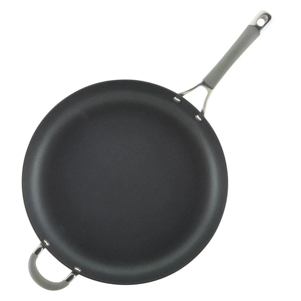 For a solution-driven skillet to cook smarter (not harder) in the kitchen, choose the Circulon Elementum Hard-Anodized Nonstick 14-Inch Skillet with Helper Handle.This essential and versatile skillet is crafted from super-tough, hard-anodized aluminum that’s twice as strong as stainless steel and boasts the TOTAL Nonstick System of raised circles and triple layer, premium quality nonstick for long-lasting food release and easy cleanup of everything from a weeknight Tuscan Garlic Chicken to a party-sized mushroom and swiss frittata for brunch. A dual riveted stainless steel handle and convenient helper handle have sleek silicone grips for a solid, comfortable grasp. Oven safe up to 400 F, the PFOA-free, metal utensil safe nonstick inside and out comes in show-stopping oyster gray exterior color and delivers superior food release and super-easy cleanup of even the stickiest recipes. Circulon nonstick technology is so advanced, it lasts 10 times longer than ordinary nonstick. That’s why Circulon comes with a Hassle-Free Lifetime Guarantee.For an everyday cooking solution that delivers on the cookware gotta-haves of nonstick performance, even heat distribution, long-lasting durability, and easy cleanup, choose the Circulon Elementum Hard-Anodized Nonstick 14-Inch Skillet with Helper Handle, because when circles align, your day delivers.