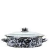 5 qt Saute Pan, 13.25 inch diameter, 3.5 inch deep. This enamelware is made of carbon steel coated with a porcelain enamel and trimmed in stainless steel. There will be variations in the shading of colors and pattern formations which are the results of the hand-dipped process. The swirl design is a classic, retro staple for enamelware cookware and serveware. The contrast of colors creates a distinct look and brings a casual artistic flair to your table setting. Each piece is individually hand crafted and is as unique as you are. Skilled artisans hand dip the white background color, then use a brush to hand apply the secondary color swirls. This creates a unique piece and design each time. The elegant and inviting aesthetic draws the eyes into the many spattered patterns flowing throughout. Your piece will be one-of-a-kind and exclusive to you as you create your own distinctive style.