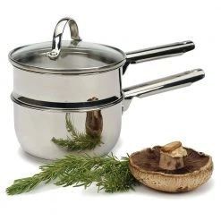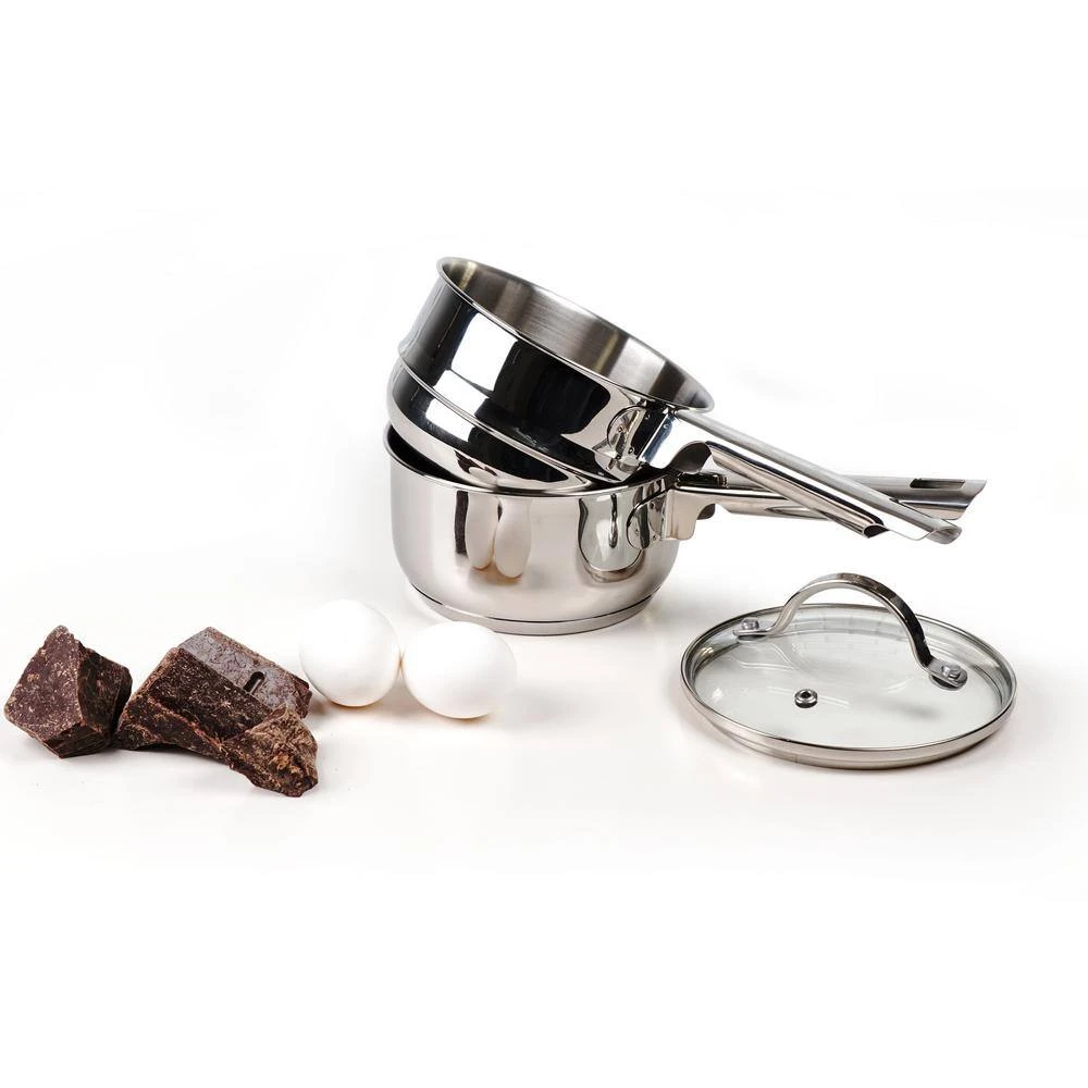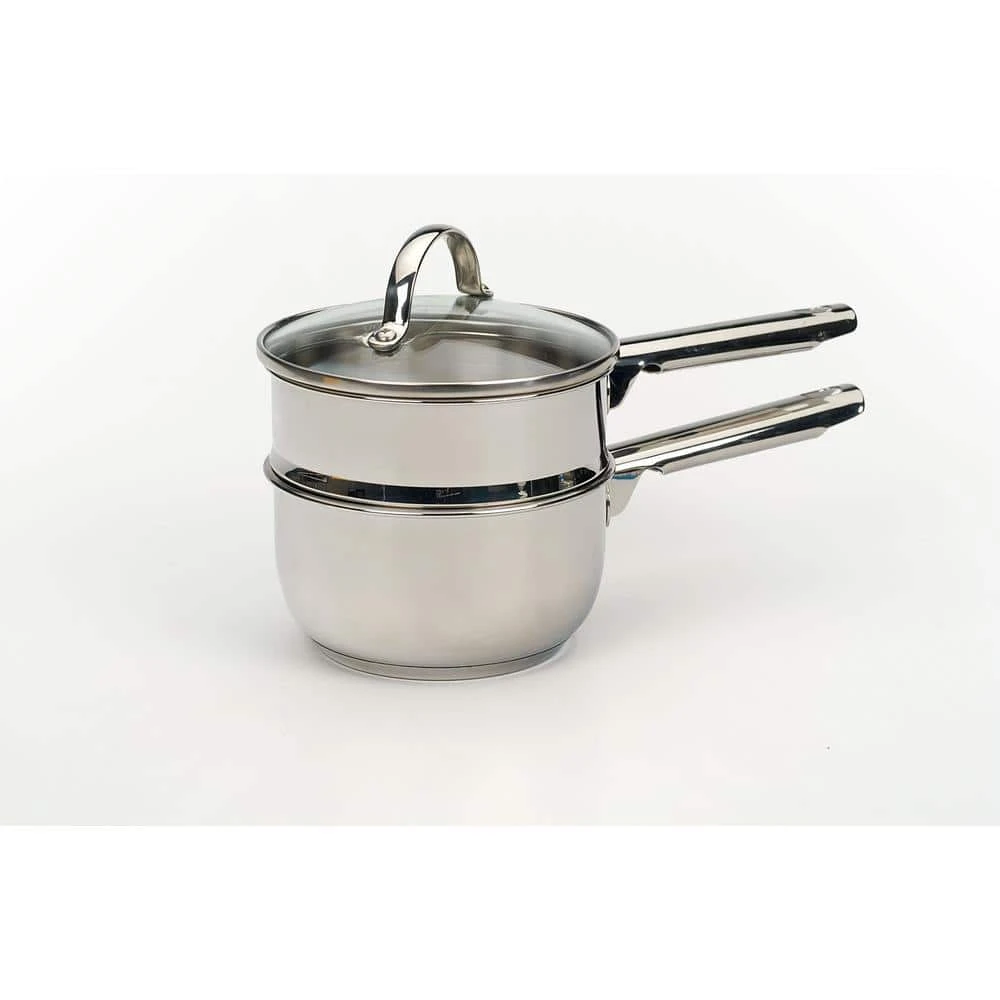 Creamy polenta, delicate sauces and perfectly tempered chocolate are practically foolproof when using our double boiler. The insert has curved sides for smooth blending and both the insert and bottom pan are made of 18/8 stainless steel with 1 Qt. capacities. The thick encapsulated base on the bottom pan is made of magnetic stainless steel with aluminum core for quick, even heat distribution. The magnetic stainless steel base makes this pot safe to use on induction cook tops. The tempered glass lid is oven proof to 450°Fahrenheit. Double boiler is 11-1/2 in. length x 6-1/2 in. wide x 6-1/2 in. high. Dishwasher safe.