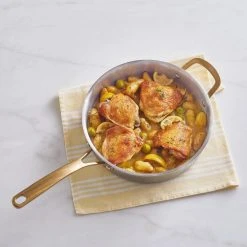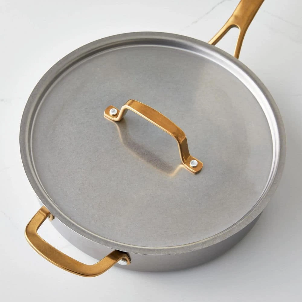 Step up your cooking skills with the Martha Stewart Everyday 3.5 Quart Tri Ply Stainless Steel Sauté Pan. The stainless-steel body brings a new array of recipes with with its stove top and oven safe feature. Each handle is embellished with a dazzling brass finished to accent the stainless-steel silver color. Hand wash after use to better preserve the stainless-steel finish. Reverse sear steaks, sauté and bake creamy gnocchi, or make the perfect stew.