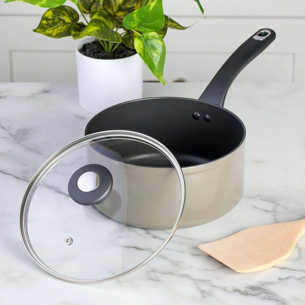 The Martha Stewart Bowcroft 3-qt. saucepan is made with a durable forged aluminum body that is perfect for making your favorite soups, sauces, and pastas. The aluminum construction heats evenly for consistent results, while the soft touch handle stays cool while you cook for safe mobility. Nonstick interior allows you to cook healthy, low oil, foods and makes clean up that much easier. Comes with a tempered glass lid with a vent hole for safe monitoring during your cooking process. Not only is this durable pot versatile and convenient, it’s also compatible with all stovetops including induction.