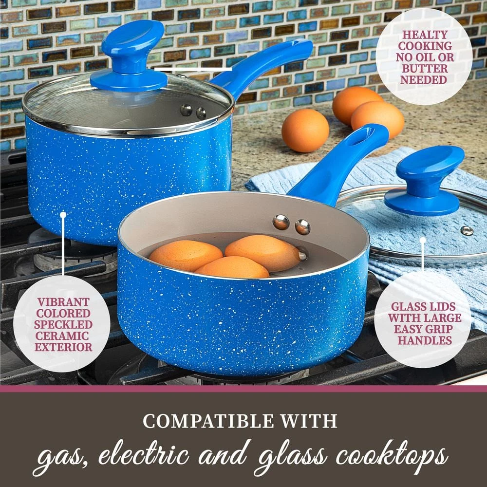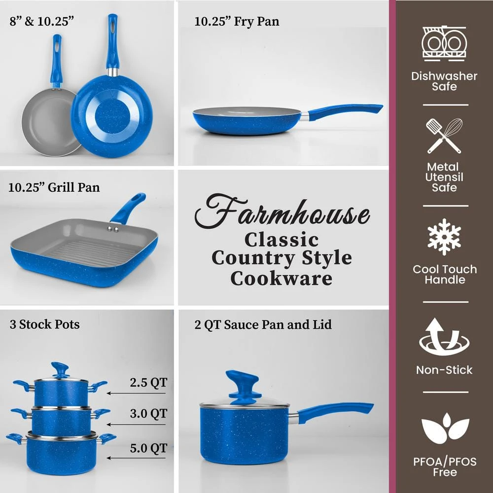 Upgrade your cookware collection with the modern performance of the Granite Stone Diamond Farmhouse Collection 13-Piece set. The Farmhouse Collection cookware features an unique and durable ceramic nonstick coating for effortless food release and cleanup. The pots and pans offer amazing heat distribution without dead zones or hot spots.