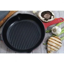 The Chasseur Round Cast Iron Grill provides all the flavor of an outdoor grill, with all the convenience of indoor cooking. This grill pan is constructed of thick cast iron to maintain its temperatureduring cooking, making it ideal for grilling anytime. While cooking, ridges allow excess fat and grease to drain, and the spouts on the edge allow for easy removal. The extra handles makes this fry pan easy to move and perfect for any kitchen.