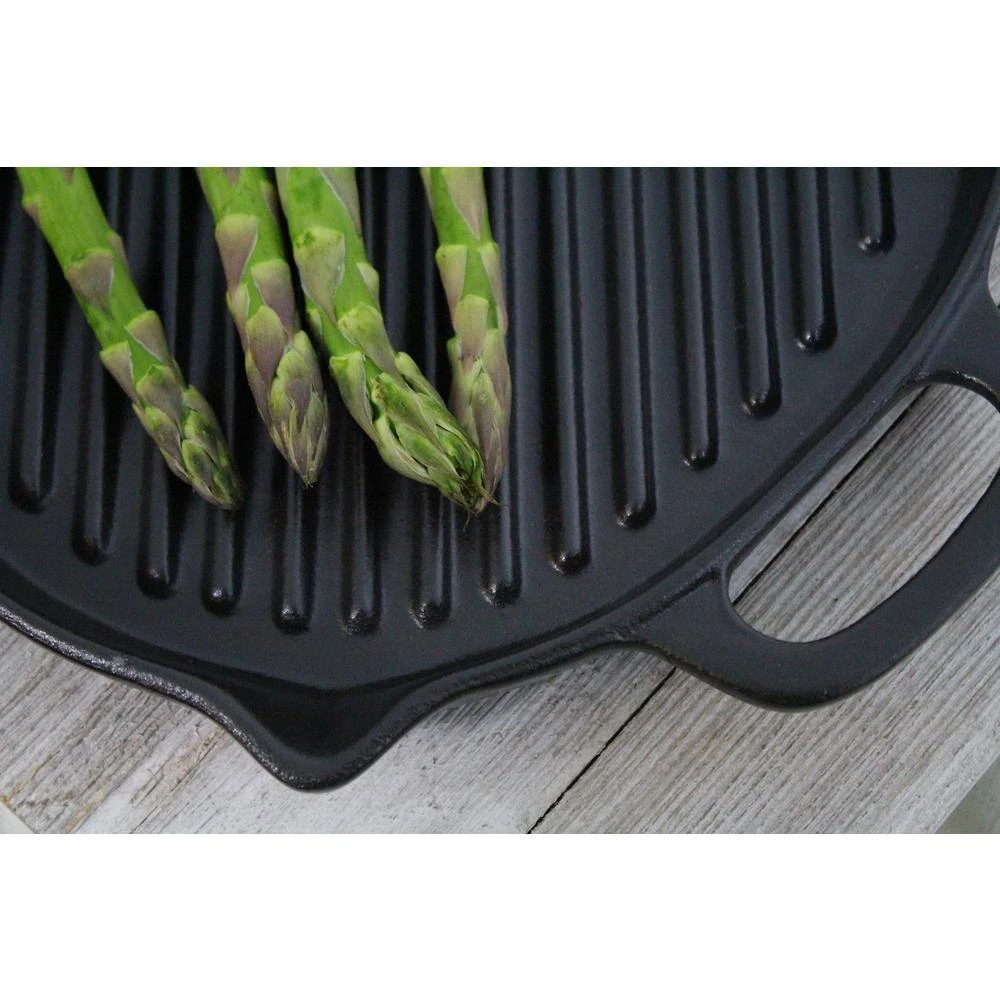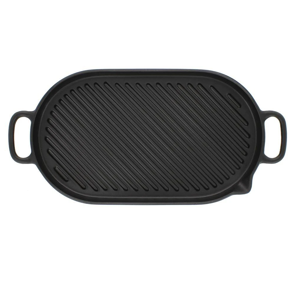 The Chasseur Oval Cast Iron Grill provides all the flavor of an outdoor grill, with all the convenience of indoor cooking. This grill pan is constructed of thick cast iron to maintain its temperatureduring cooking, making it ideal for grilling anytime. While cooking, ridges allow excess fat and grease to dra in. Easy to clean and easy to use, and with a beautiful black enamel coating, this grill pan is the perfect addition to any kitchen.