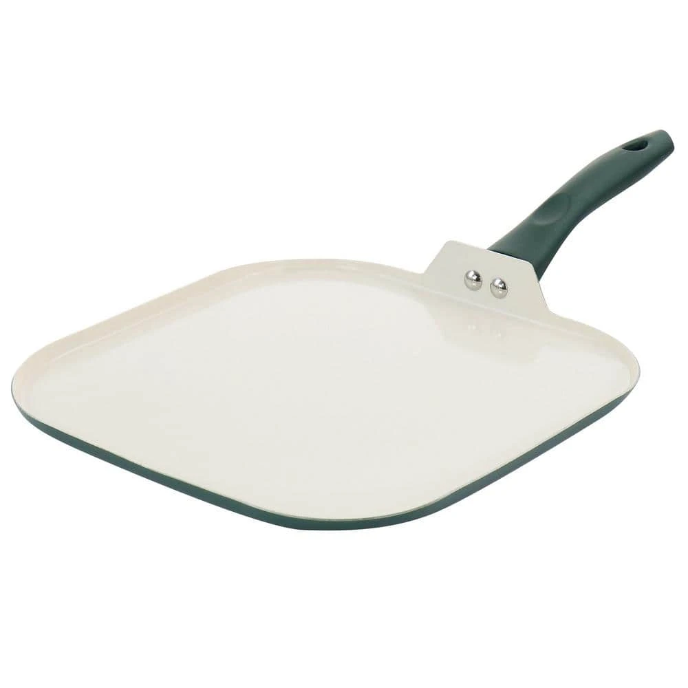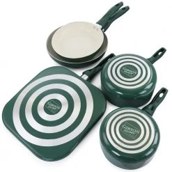 - Set includes: one 5 qt. dutch oven with lid, one 3.5 qt. saute pan with lid, one 2 qt. saucepan with lid, one 1.25 qt. saucepan with lid, one 9.5 in. frying pan, one 11 in. square griddle pan, one 8 in. frying pan