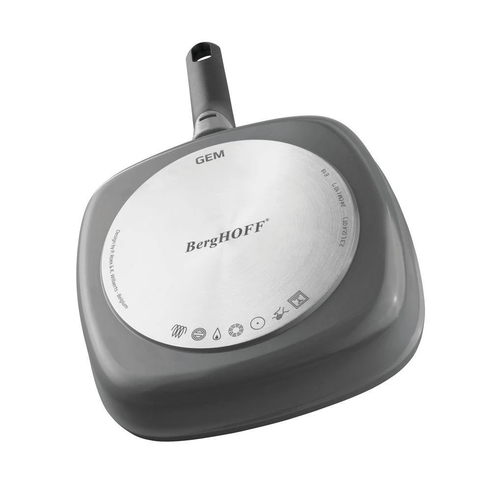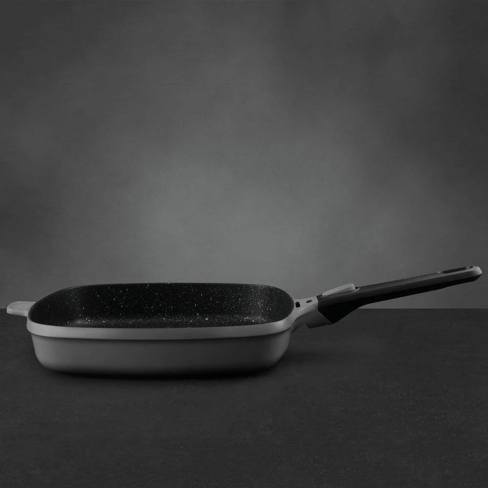 A batch of perfectly seared burgers, salmon fillets or vegetables, it’s a piece of cake when you’ve got this 28 cm grill pan at your side. The aluminum body ensures a fast and even heat distribution on any kind of stovetop while the ridged base gives your ingredients those typical sear marks and allows moisture and fat to escape for an extra crispy result. No need to worry about the clean-up thanks to the multilayered non-stick coating that guarantees an easy food release. An added bonus is the detachable handle that allows you to use the pan in the oven and save valuable storage space. Suitable for all cooktops including induction. Inside dimensions: 11 in. x 11 in. x 2 in. outside dimensions: 20.5 in. x 11.25 in. x 4 in.