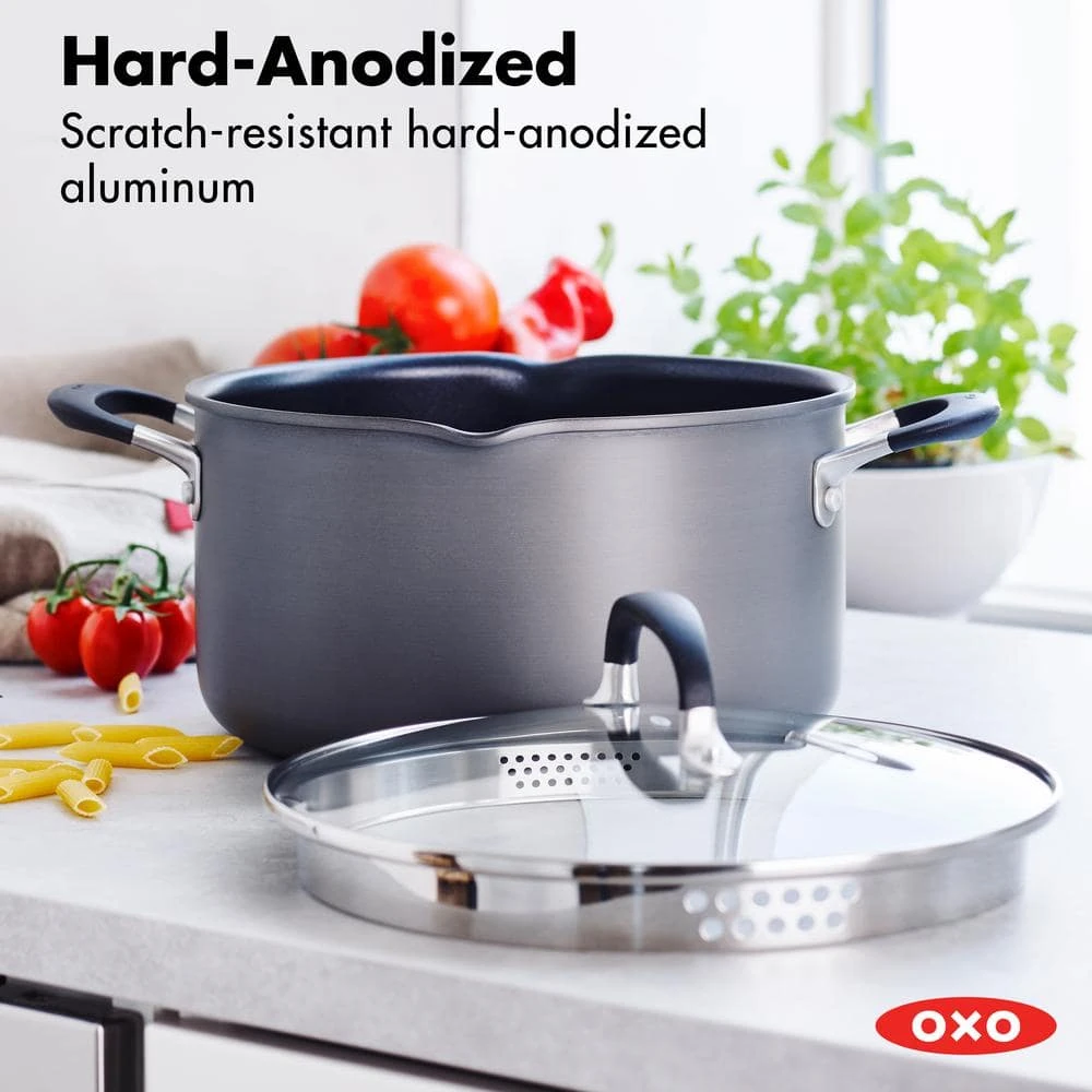This pot from the OXO Good Grips Non-Stick collection is specially designed to make straining easy. A handy side spout and lid with variable sized holes helps you strain without worry. A 3-layer non-stick coating offers years of sticky-free performance.