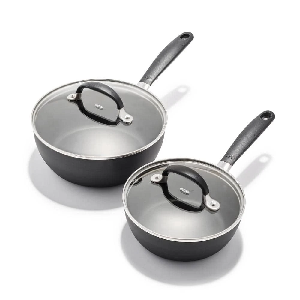 Cook like a pro with the OXO Good Grips Non-Stick Saucepan Set. Both pans feature a 3-layer, German-engineered non-stick coating that provides effortless performance while using less oil and delivers quick and easy cleanup. The scratch-resistant, hard-anodized bodies heat faster and more evenly than traditional aluminum and the silicone-wrapped stainless steel handle helps keep cooking comfortable. Angled side walls help liquids evaporate quickly and the rounded bottoms help with efficient stirring. The durable glass lids make it easy to check on your progress, whether you’re simmering stew or braising meat. Hand wash. Oven safe up to 390°F/200°C.