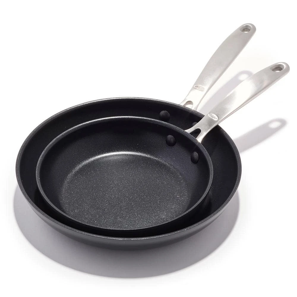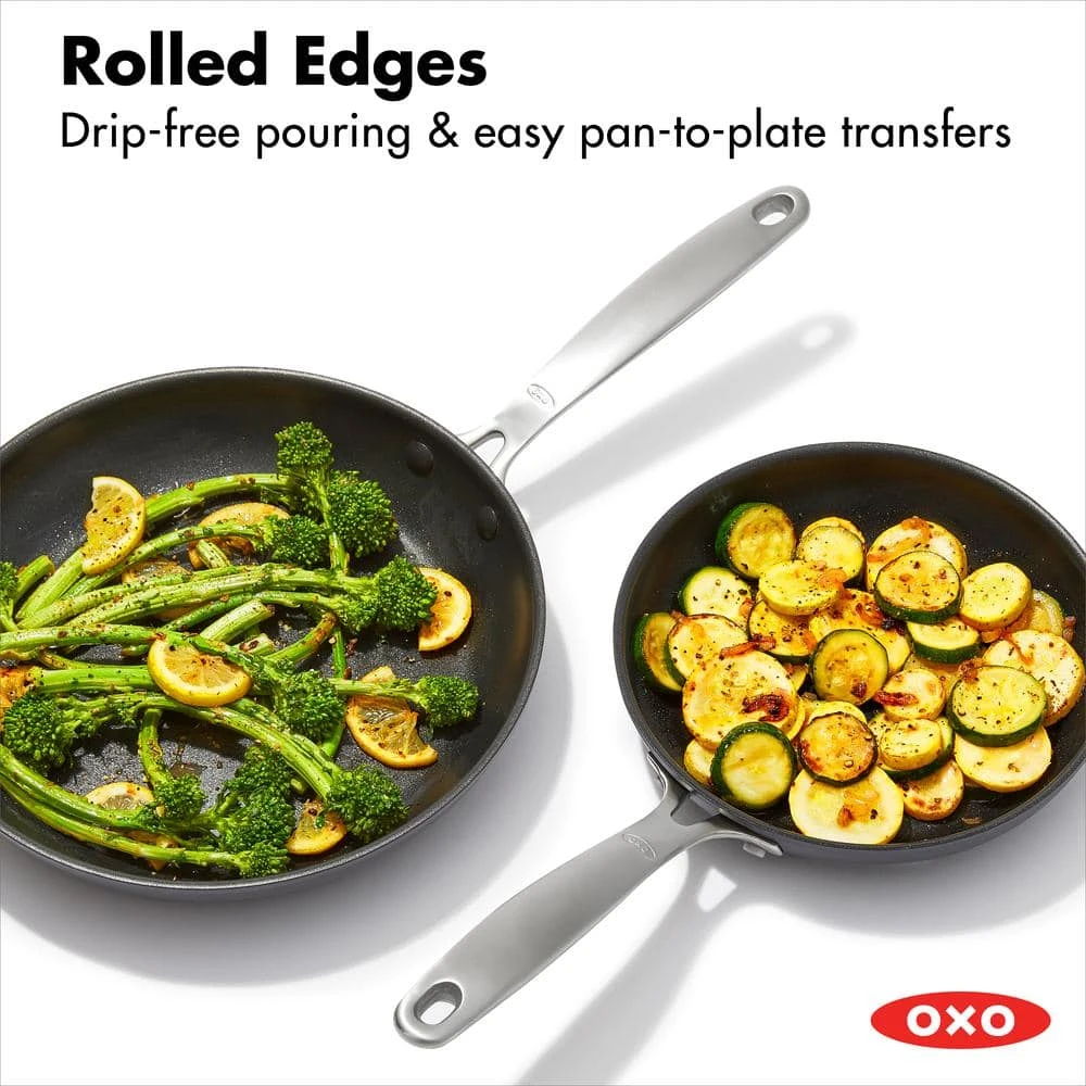 Build a better kitchen with the OXO Good Grips Pro Non-Stick Frying Pan Set. The 8-in frying pan is your go-to for eggs and grilled cheese and the 10-in pan is ideal for sauteing veggies and cooking fish. The pans feature a 3-layer, German-engineered non-stick coating that provides effortless performance while using less oil and delivers quick and easy cleanup. The set’s scratch-resistant, hard-anodized bodies heat faster and more evenly than traditional aluminum and stainless steel handles make these pans extra tough. Dishwasher safe. Oven safe up to 430°F/220°C. Set includes 8-in/20 cm and 10-in/25 cm Frying Pans.