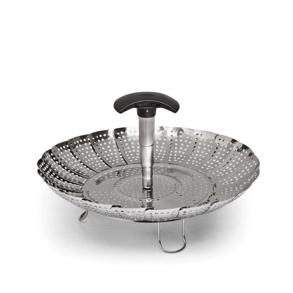 With a simple pull of the Stainless Steel Steamer’s telescoping handle, it extends to provide added length, making it easy and safe to use in hot pots. Press the handle again to lock it down and fold feet in for compact storage. For even more reach, a fork can be inserted into the handle. Steamer works well in most pressure and multi-cookers. No kitchen is complete without this vegetable steamer.