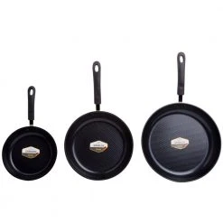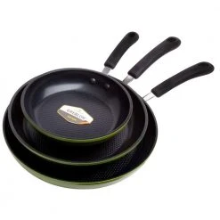 Utilizing GREBLON an ultra-safe ceramic coating from Germany, the Green Earth Pan Set by Ozeri achieves non-stick perfection while remaining absolutely free of PTFE, PFOA, APEO, NMP and NEP. The set includes an 8, 10 and 12 in. pan, each featuring a honeycomb textured cooking surface that prevents food bonding and distributes heat to enhance cooking performance. Conventional pans achieve their non-stick performance through a synthetic coating of PTFE (PolyTetraFluoroEthylene). At high charring temperatures, PTFE can release fumes which are documented to be lethal to small pets, and can be harmful to humans. Traditional pans are also often made with the aid of PFOA (PerFluoroOctanoic Acid), a potential carcinogen, and APEOs (Alkylphenol ethoxylates), which are under restricted use in Germany due to environmental concerns. With the Green Earth Pans, no such harmful toxic substances are released. Each Green Earth Pan utilizes an inert ceramic coating that is applied using a water based Sol Gel Technique which is free of the lesser known but potentially harmful chemicals NMP (N-Methyl-2-pyrrolidone) and NEP (N-ethyl-2-pyrrolidone). The Green Earth Pans possess superior non-stick properties that allow you to saute with half the oil normally used, and cleaning is a breeze. Each pan is made of die-cast aluminum with a magnetized bottom for induction stoves, and a heat-resistant silicone-coated handle. GREBLON made by Weilburger GmbH, Germany. Final assembly in China.
