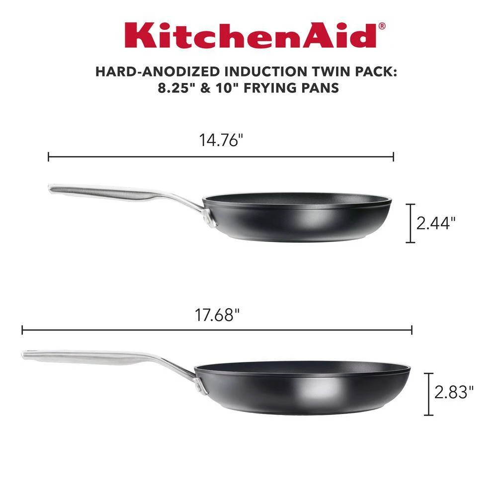 Take control with even heat and achieve consistent results when cooking with the KitchenAid Hard Anodized Induction Nonstick Frying Pan Set. Crafted from heavy-gauge, hard anodized aluminum, these nonstick frying pans are durable enough for everyday use to experiment with new, exciting recipes and cooking techniques in the kitchen. Thick, forged bases are designed to heat evenly, eliminating hot spots for beautifully browned results on any stovetop. Triple-layer, PFOA-free nonstick on the skillet interiors and handle rivets provide effortless food release for a completely nonstick cooking surface. Meet recipes head-on with these induction compatible frying pans that are oven safe to 500°F and dishwasher safe for easy cleanup.