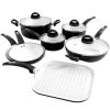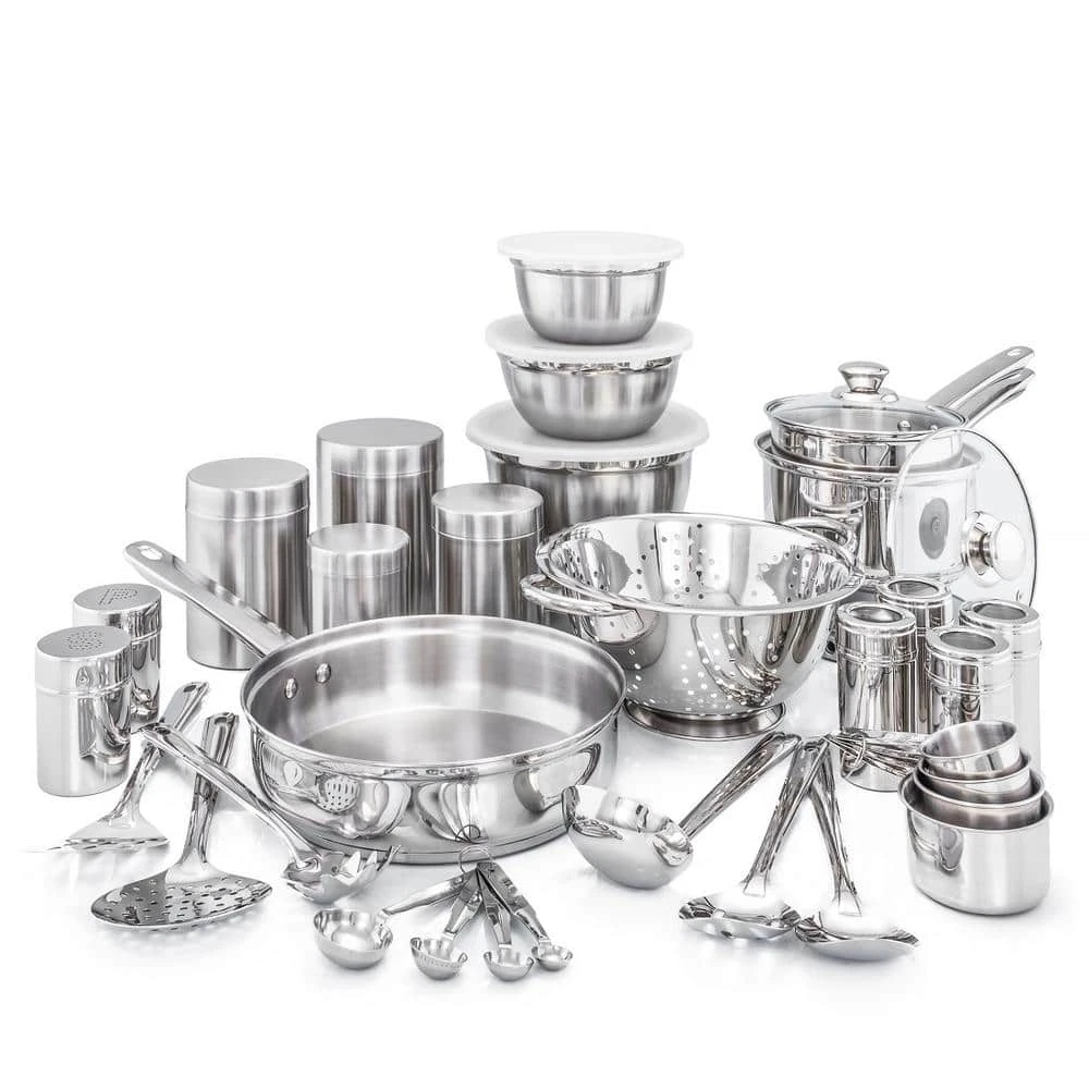 - Includes: frying pan, sauce pans with lids, colander, mixing bowls with lids, salt and pepper shaker set, 4 piece canister set, measuring spoons, measuring cups, set of 4 spice containers, ladle, solid and slotted spoons, skimmer and pasta server