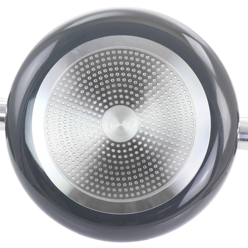 The Oster Legacy 5 qt. Aluminum Nonstick Everyday Pan in Gray flares up and completes the kitchen. Features a clean glossy exterior with tasteful stainless steel accents. The nonstick interior provides easier food release for more comfortable cooking. Heat resistant Bakelite handles and knobs prevent accidental burns during the cooking process. For long lasting quality and care, only wash the cookware by hand. Fry veggies, boil savory soups, or fire up pork chops for an unforgettable dinner.